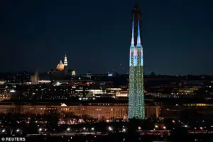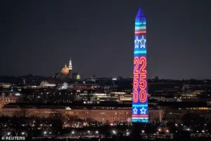Organizers described the event as a celebration of the ‘triumph of the American spirit,’ with projections of iconic landmarks like the Empire State Building and the Statue of Liberty illuminating the monument’s surface.