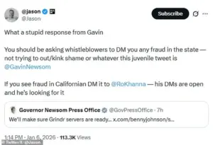 The controversy has also drawn comparisons between California and Minnesota, with Johnson claiming that ‘Gavin Newsom’s California is far worse’ than Minnesota when it comes to fraud.