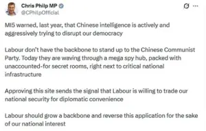 Critics argue that the government has not adequately addressed concerns about the embassy’s potential to become a hub for hostile intelligence operations. ‘The Chinese state is a hostile intelligence power,’ Philp said, reiterating that Labour’s approval of the site would be a betrayal of national security.