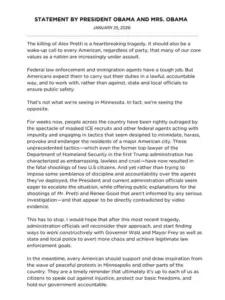 The former president also praised the wave of peaceful protests that have erupted across the country in response to the shootings. ‘People have been rightly outraged by the spectacle of masked ICE recruits and other federal agents acting with impunity,’ he wrote, a reference to the heavily armed and often anonymous presence of agents in communities nationwide.