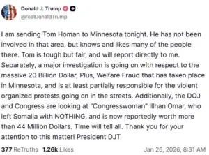 President Trump’s decision to send Homan to Minnesota, a move he described as necessary to quell “violent organized protests” and address a “massive 20 Billion Dollar, Plus, Welfare Fraud” case in the state, has further fueled tensions.