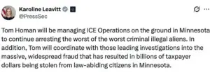 White House press secretary Karoline Leavitt said in a separate social media post that Homan will coordinate with officials leading ongoing investigations into fraud schemes in Minnesota